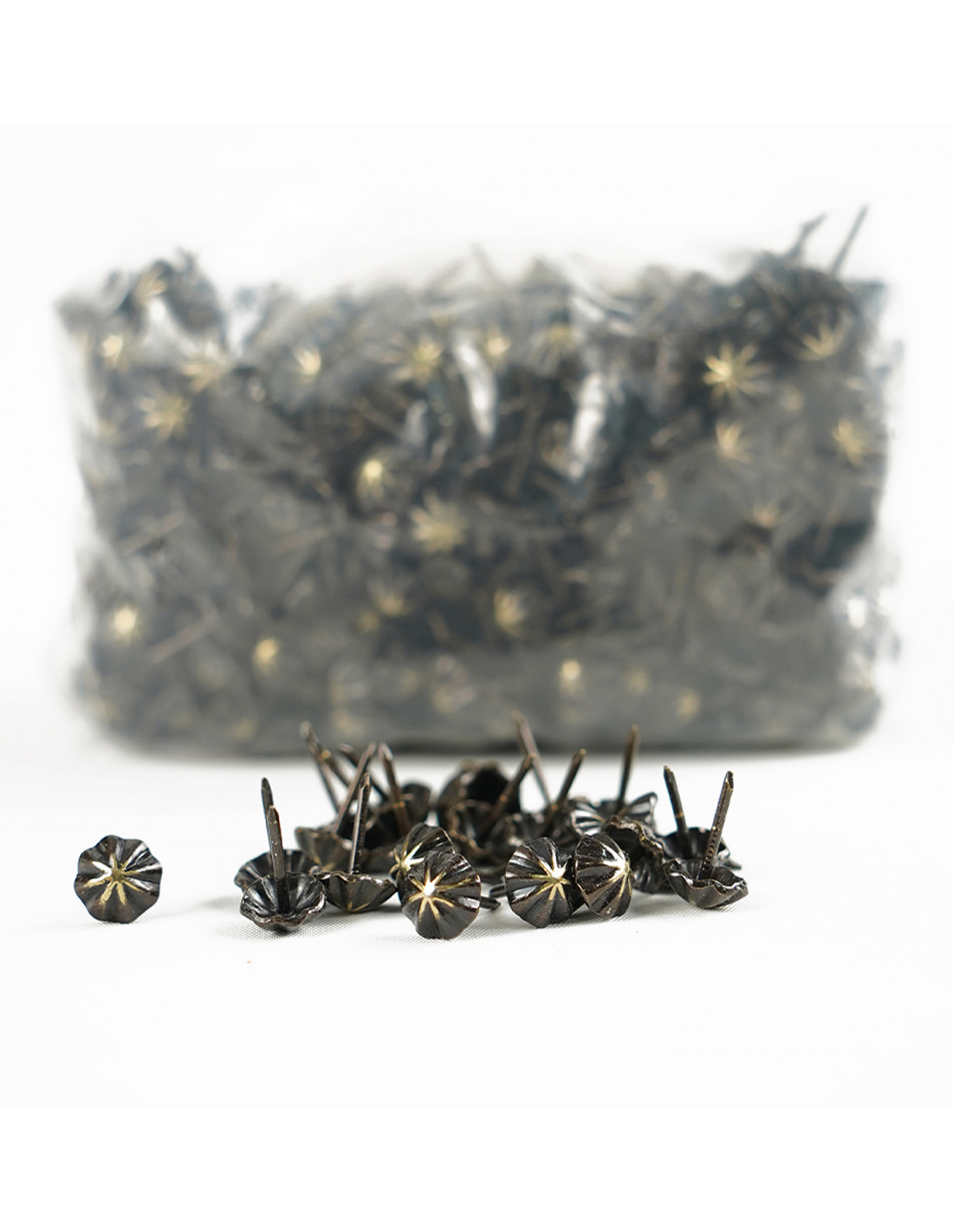 The collective package contains 1000 pieces of decorative pins in the shape of an umbrella. A small element used to decorate upholstered furniture, as well as a great idea to hide the connection of the furniture structure with the fabric. The pins are made of high-quality materials - durable metal decorated in various ways, which makes them much more durable and perform their functions better. An upholstery pin is also an element needed to decorate wooden furniture.